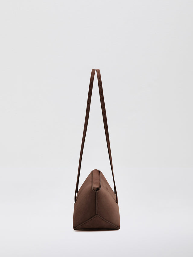 Form and function combines with this mini suede tote bag. Designed with sculptural folds and peaks, its minimal flap opening can be tucked in to reveal an embossed custom logo.