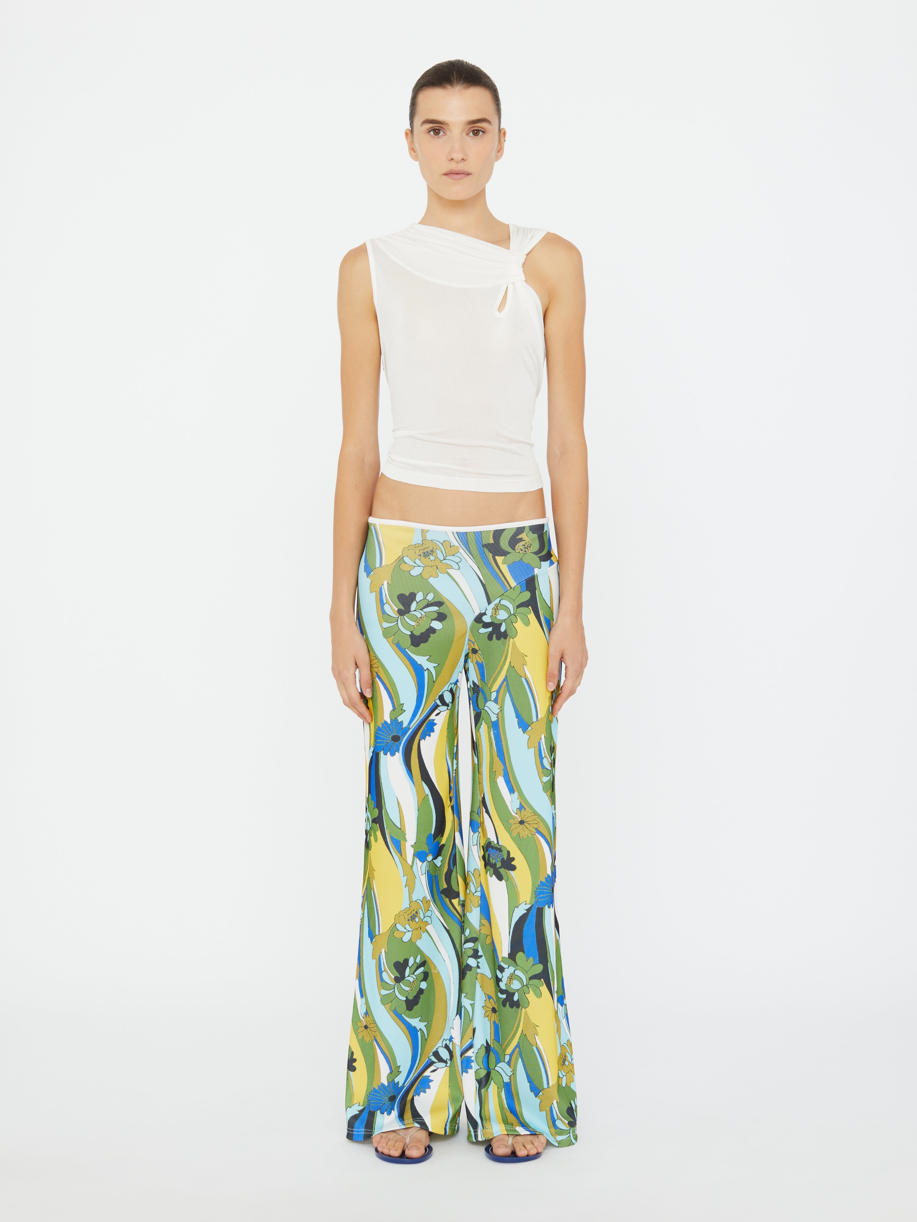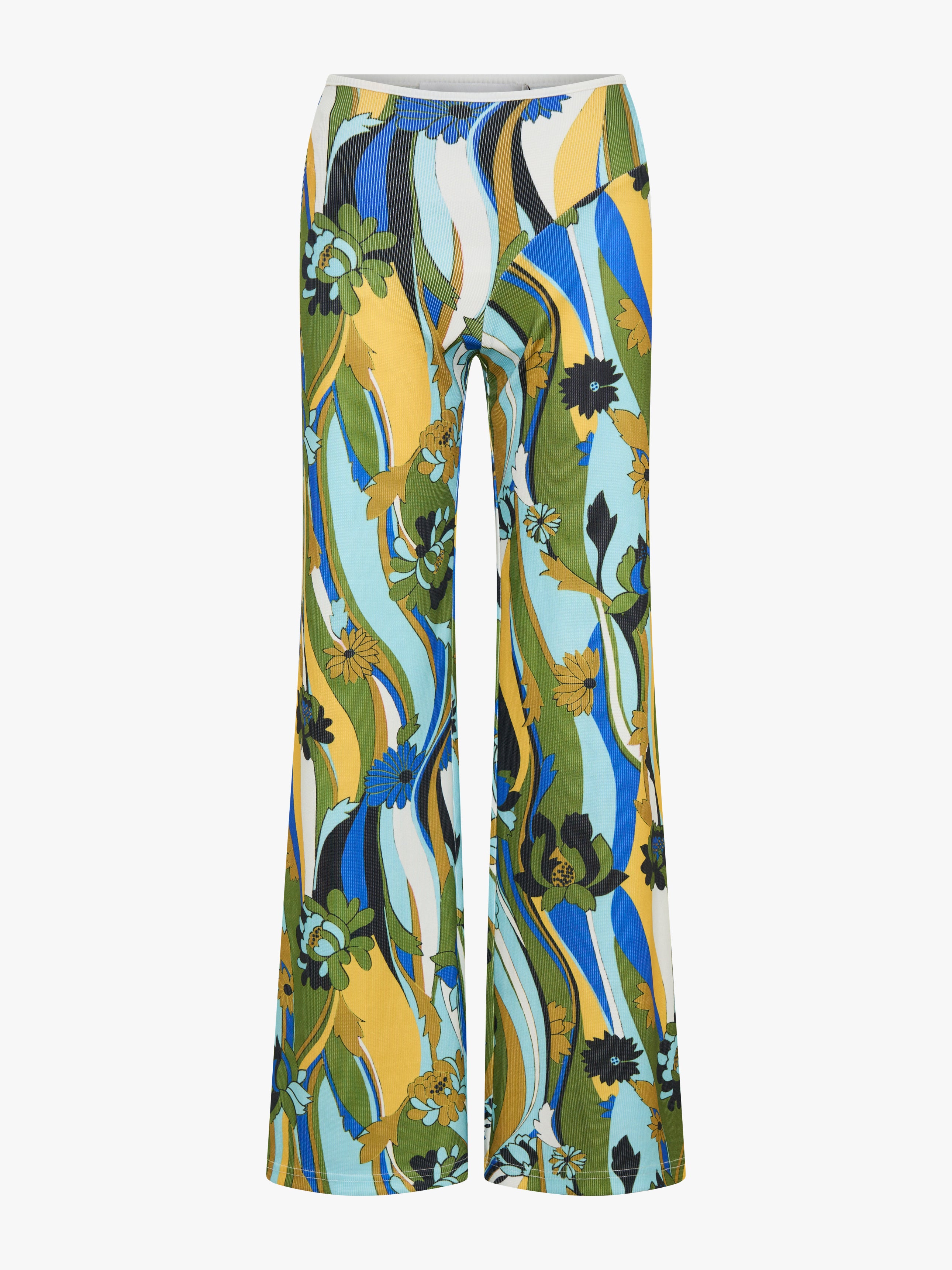 Crafted in fluid stretch jersey, the Acidic Floral Rib Pant features a fitted waist and wide-leg silhouette that moves with ease. A custom hibiscus wave print reimagines vintage surf motifs in saturated shades of citron, azure, and fern. Designed to sit low on the hip, pairs this style with a minimal tank or sheer rib knit for balance.