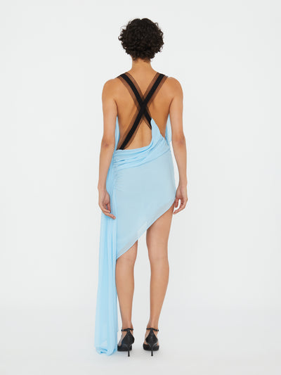 Crafted in fluid silk georgette, this Framed Floating Silk Dress features a softly gathered bodice that falls into an angled hemline. A contrast Chantilly lace trim traces the neckline and drapes down the side, adding a delicate yet directional finish. Lightweight and sheer, the silhouette is layered for movement and dimension.