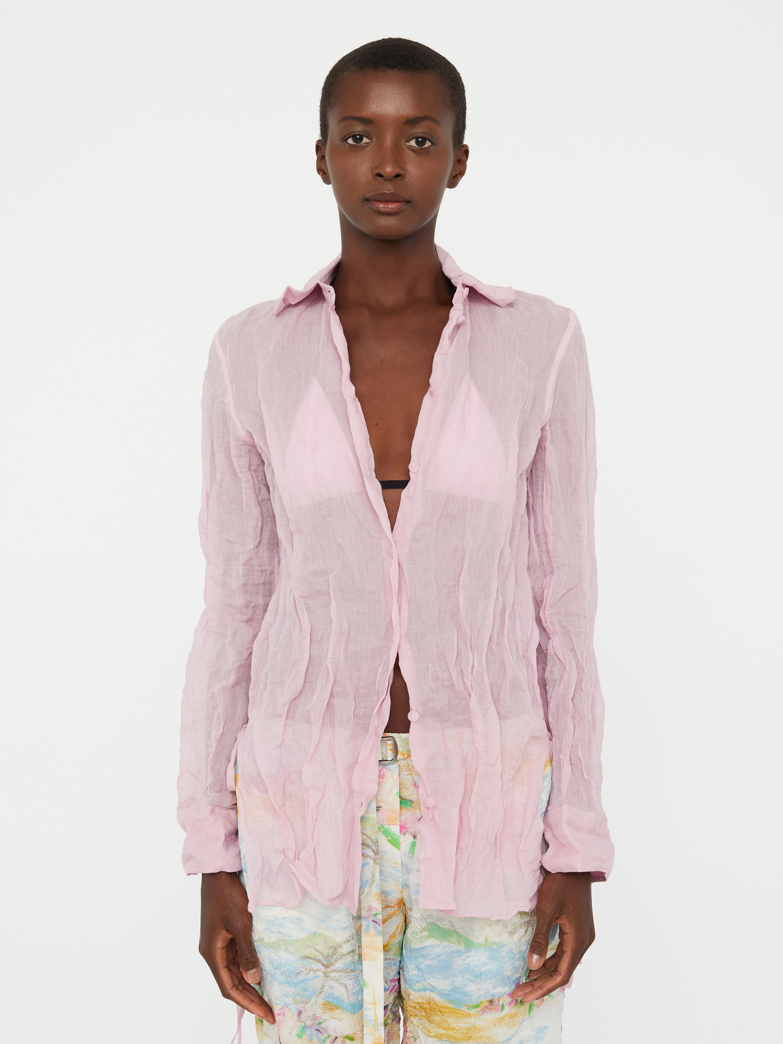 Designed in crushed textures that balance formality with ease, the side tie shirt features a lived-in finish that balances to the carefree spirit of coastal dressing with tailored structure. This relaxed fit shirt is cut in a demi-sheer cotton infused with fine metal yarns that hold its crushed form.