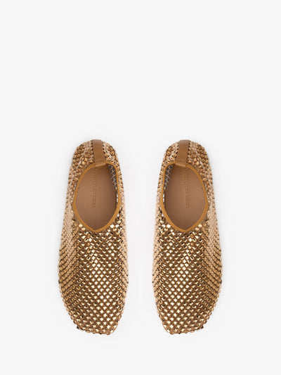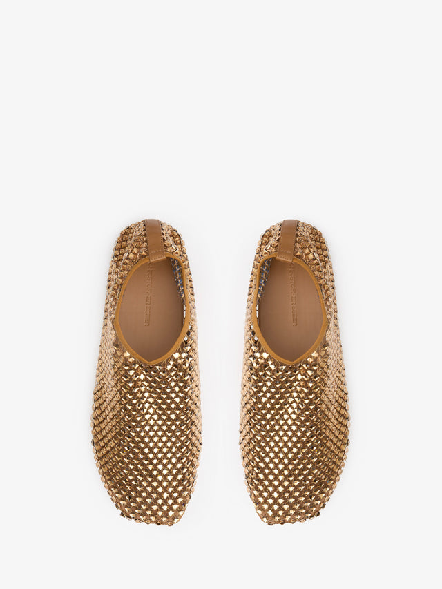 Lightweight and sculptural, featuring fine mesh upper encrusted with micro crystals. The form is a netted silhouette that softly encases the foot and grounded by a leather minimal sole. The slip-on profile makes for effortless transition from off-duty to after-dark.