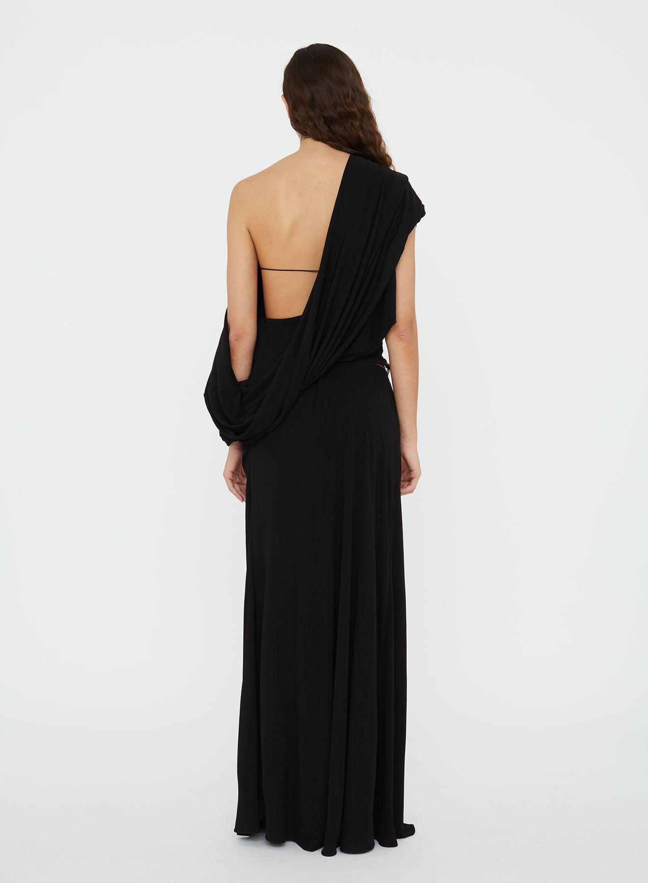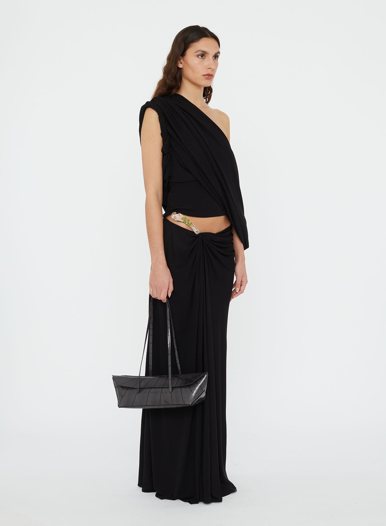 Crafted in stretch viscose jersey, the Encased Nature Suspended Jersey Skirt is defined by a gathered, asymmetric waistband that drapes to the floor. A custom cast resin hardware - set with preserved maidenhair ferns - anchors the silhouette at the hip, revealing skin through a curved cut-out. Designed to sit low on the waist, with fluid movement through the hem.