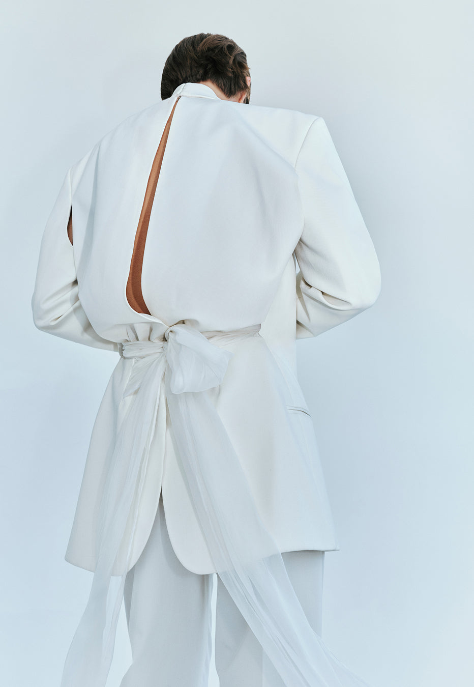 Exploring the interplay between sharp tailoring and fluid details, pieces appear simultaneously bold and effortless.