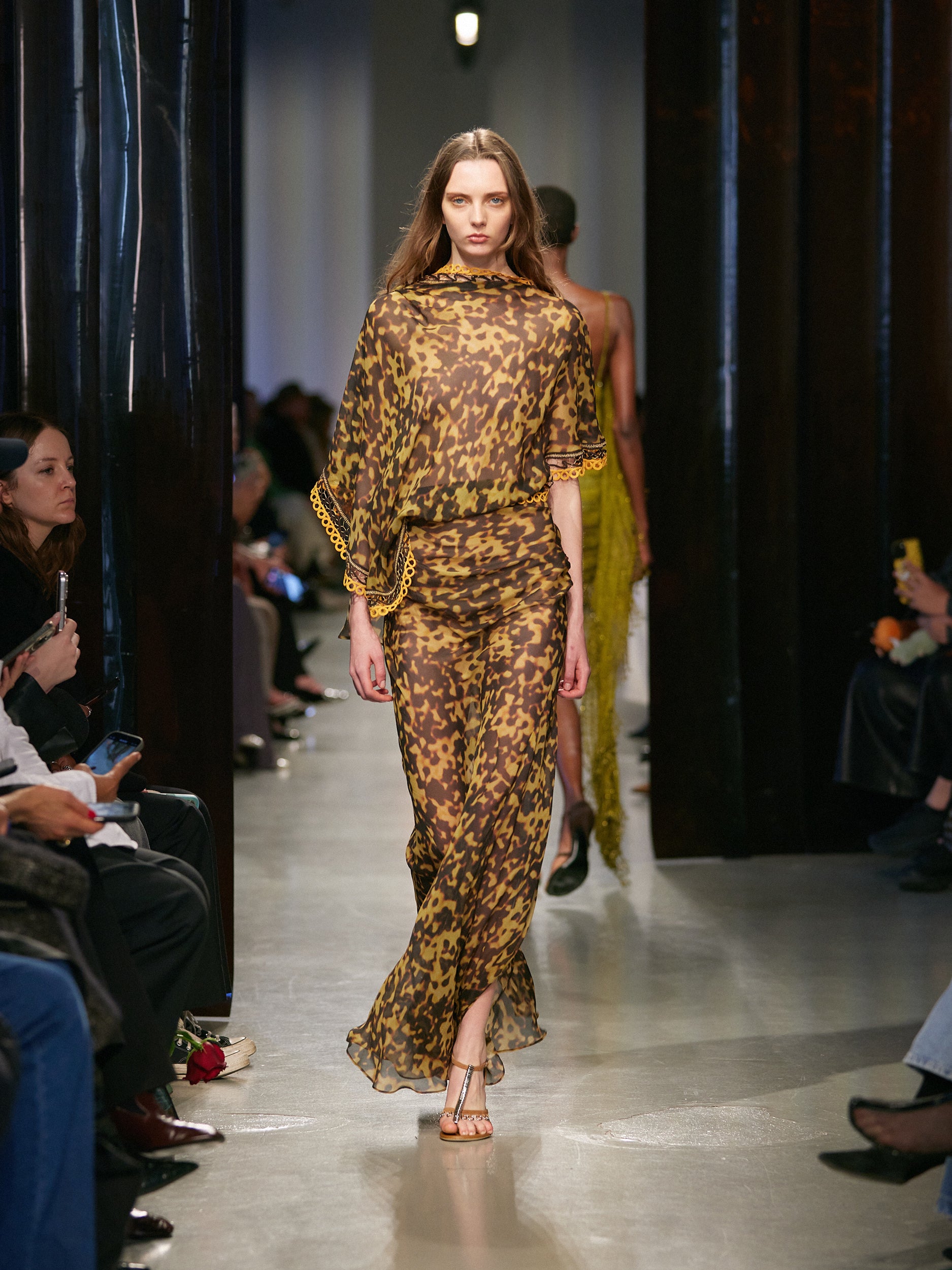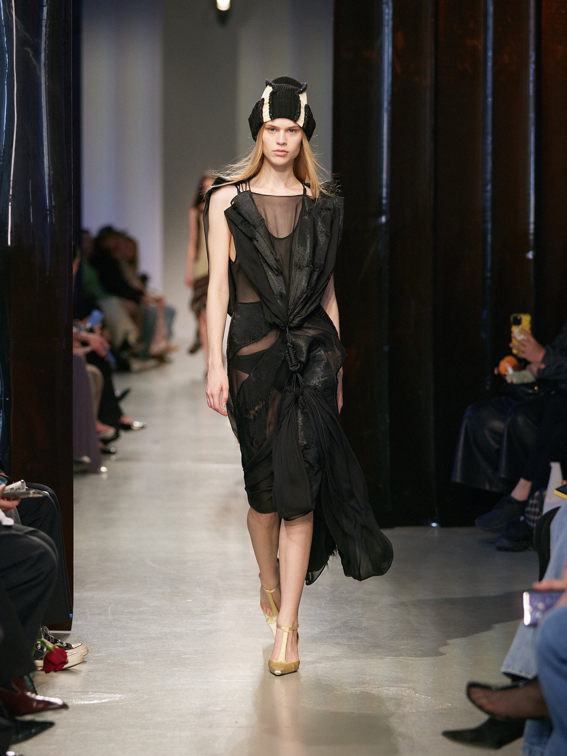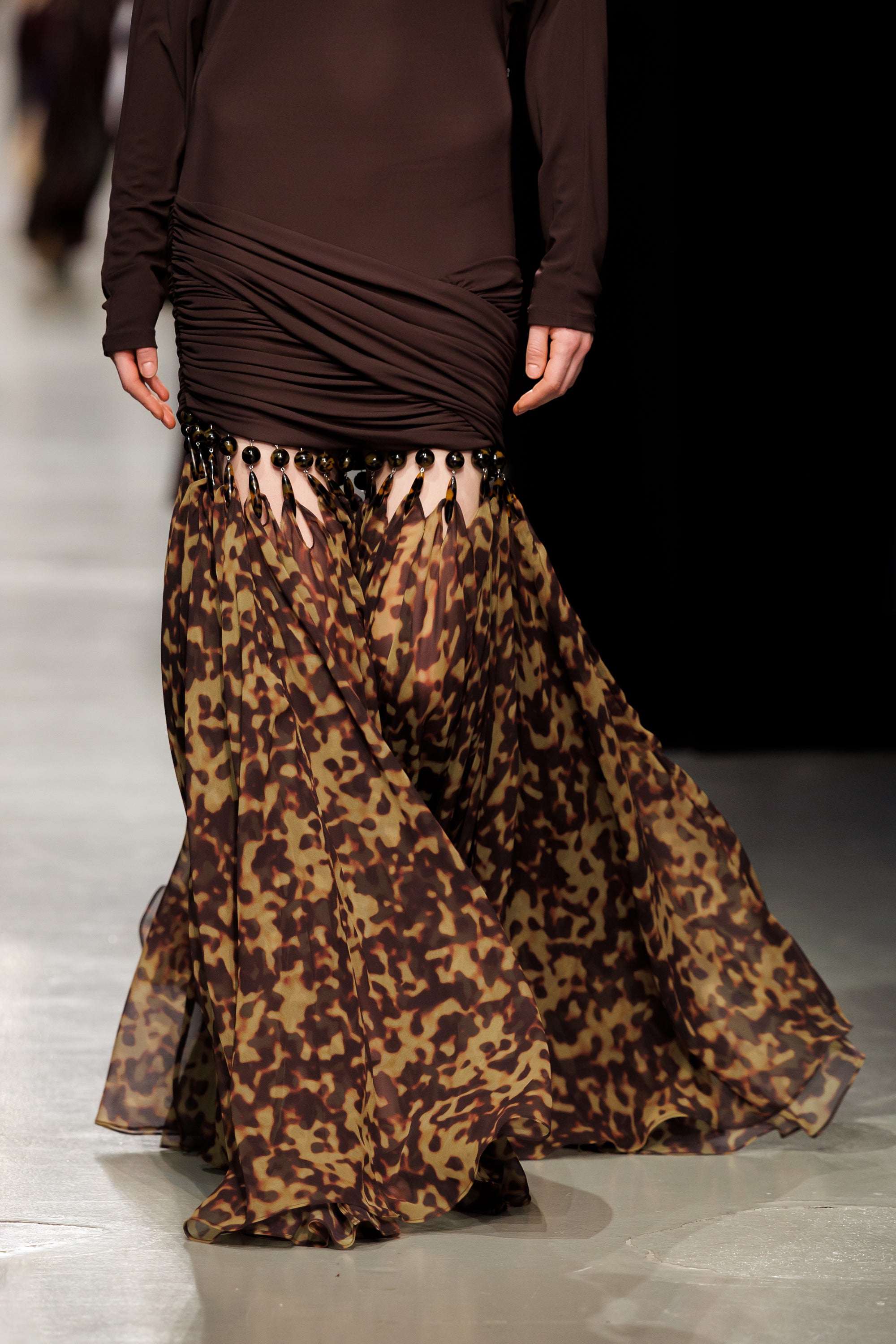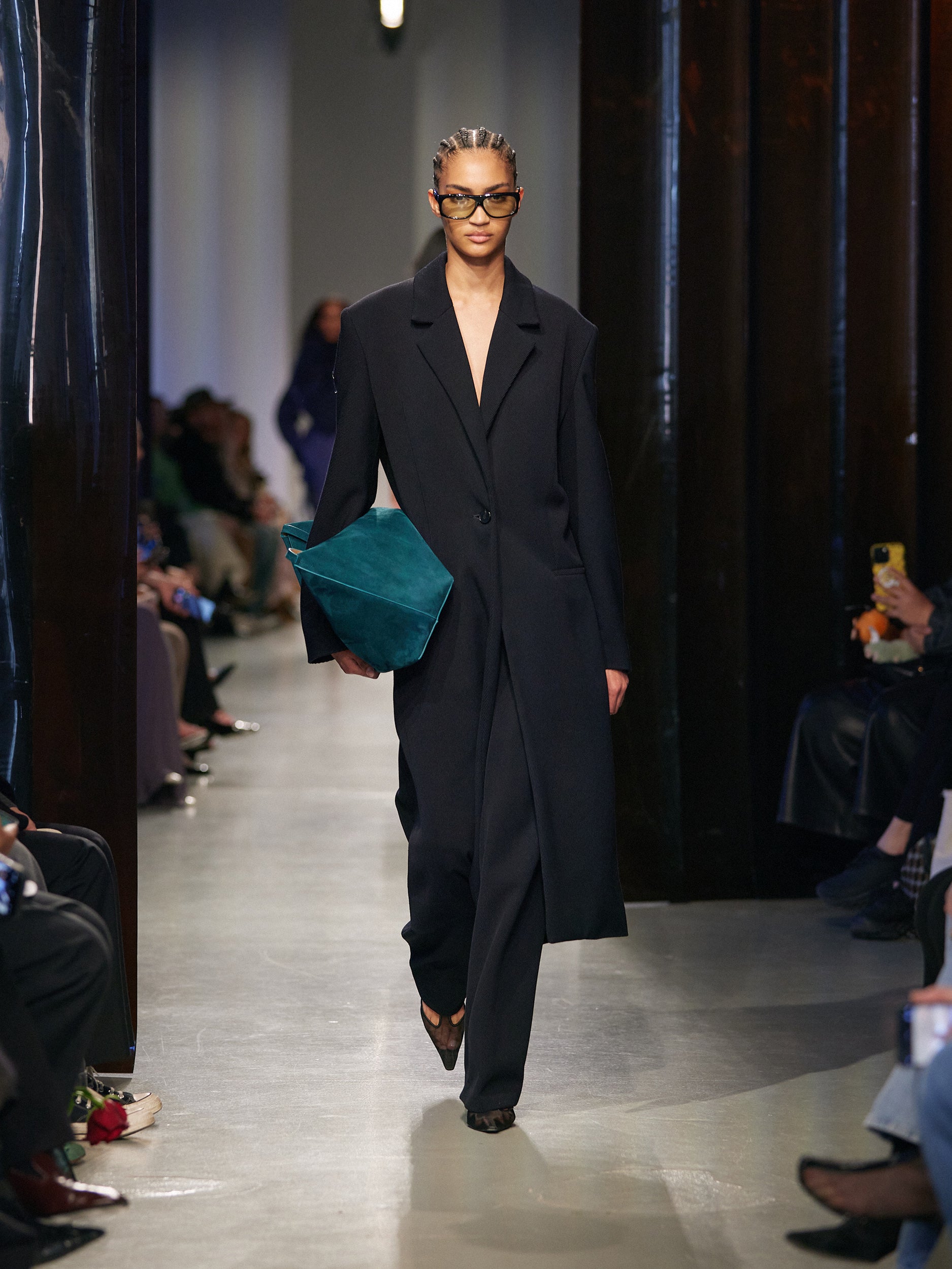 The palette zeroed in on effortless elegance, where deep navy interacted with mustard, and rich purples and blacks gained a sense of levity alongside frothy sage greens. Liquorice, maroon and espresso leathers added depth, while metallic laces intertwined with metal accents, merging with plush velvets.
