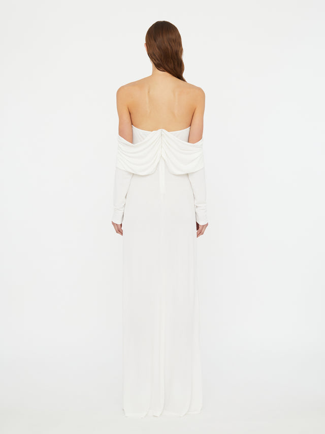Evolved from the brands signature arced palm silhouette, sculptural hardware anchors a plunging neckline in this shawl gown. Crafted in fine interlock jersey that ruches and defines the waist.