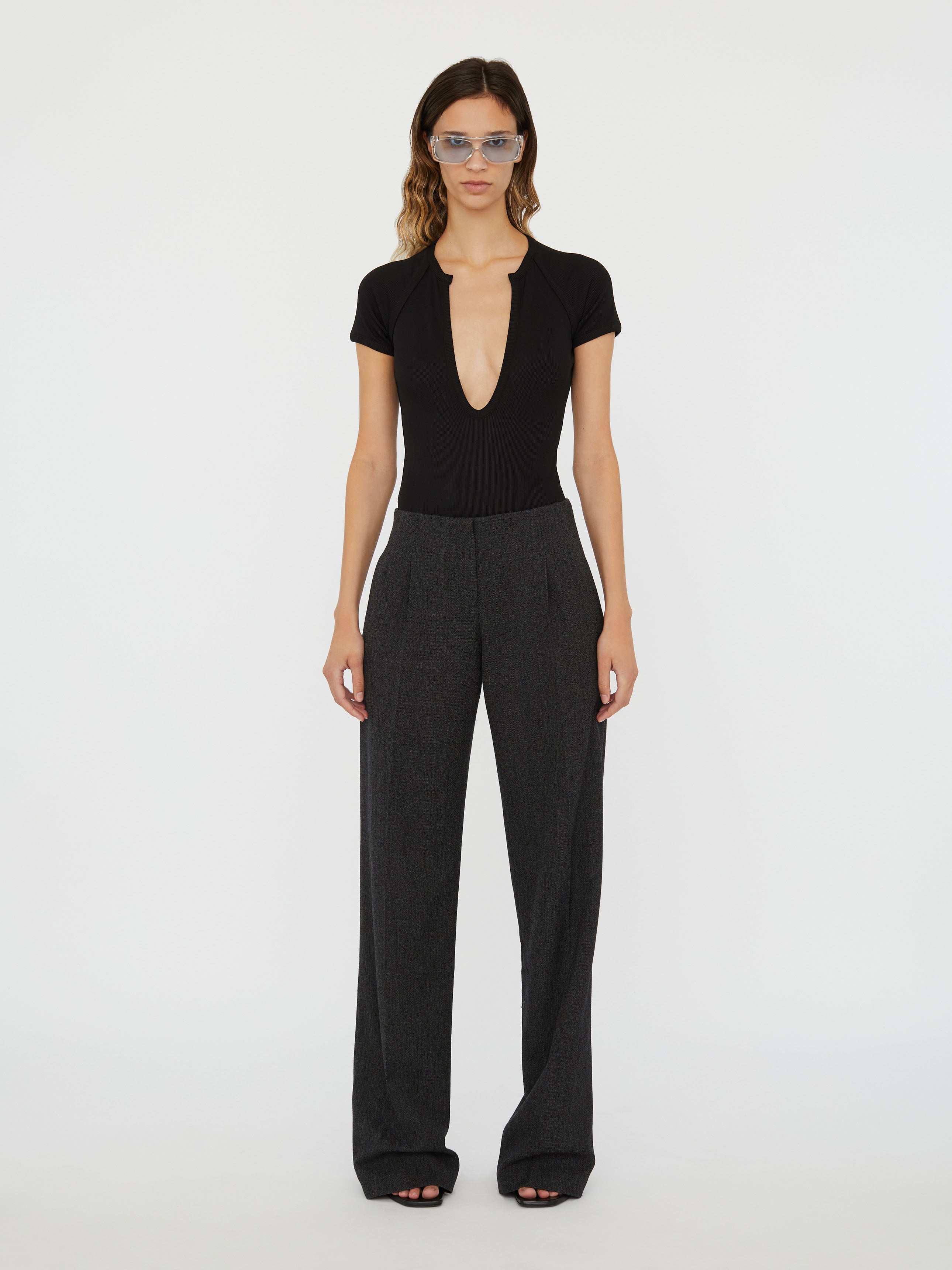 Codes of everyday wear spark curiosity with this Concave Tee Bodysuit. Fine rib stretches with ease over the body, considered split crew neck with contrast bind detail frame the neckline.
