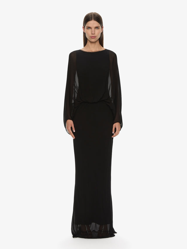 Cut in fluid black silk, draped front and floor-skimming column skirt