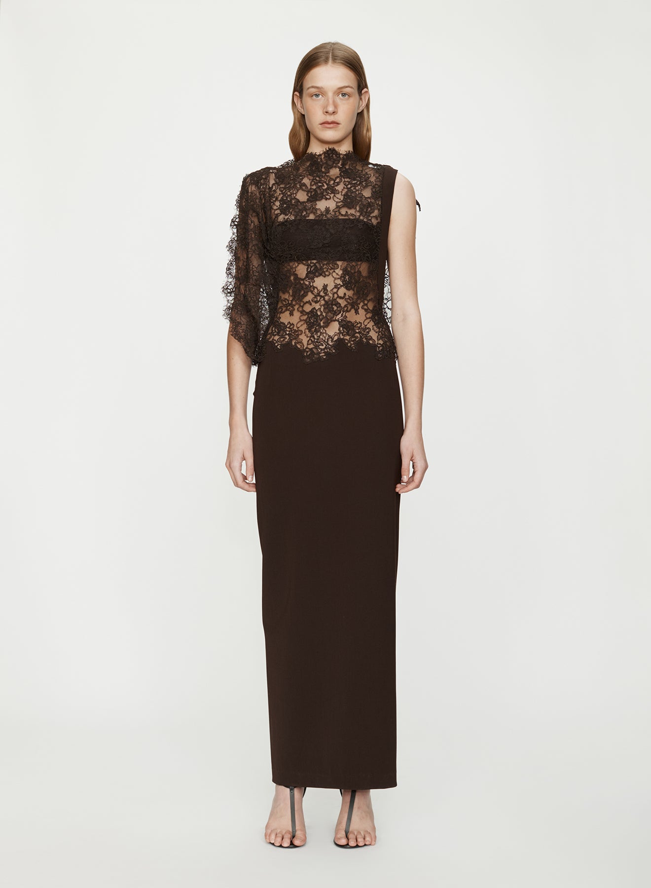 A column gown combining structured tailoring with delicate transparency. Floral lace drapes across the bodice and one sleeve, suspended over a contoured column skirt in wool blend crepe. The interplay of opacity and sheerness defines the silhouette with architectural restraint.