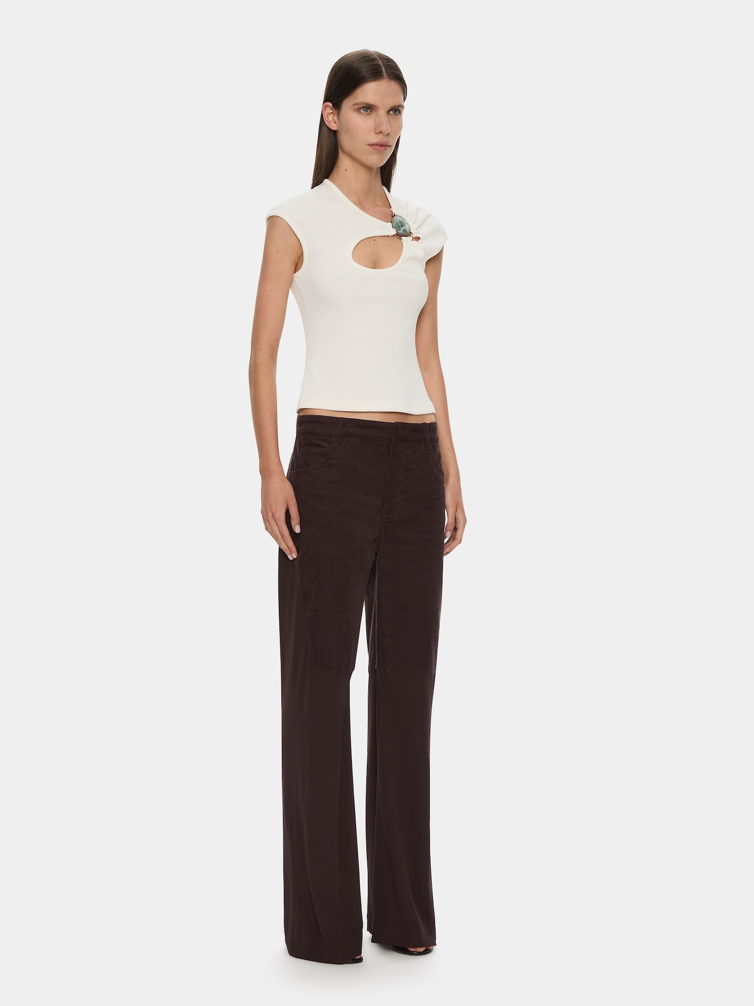 Cut in stretch rib with a close, flattering fit, the silhouette is punctuated by an off-centre cutout, anchored by a custom tiger’s eye resin ring. Cap sleeves and a high neckline maintain balance and ease.