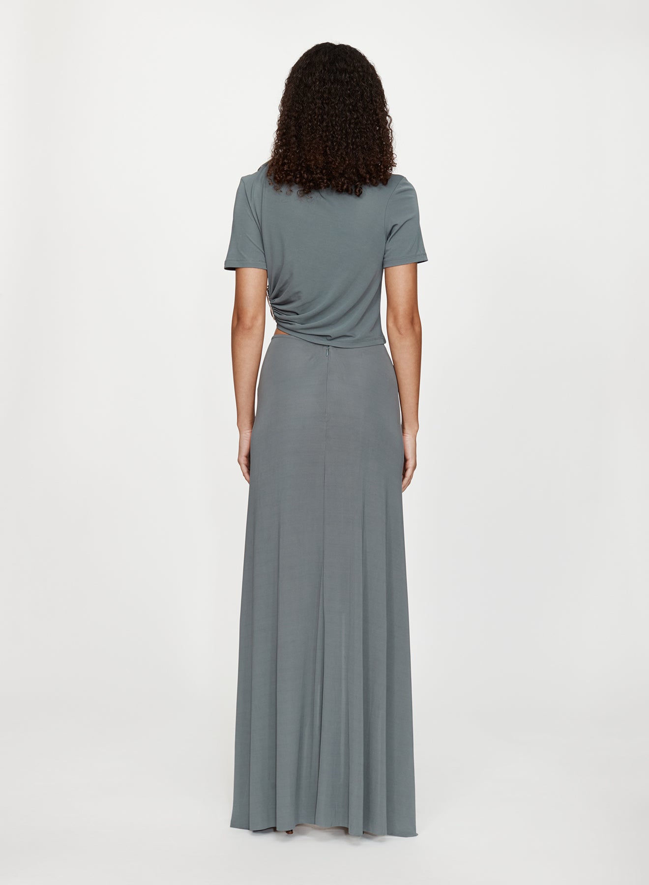 Ruched jersey is anchored by custom silver hardware cast with natural stones in the Orica Crystal Ruched Jersey Tee. Sculpted draping and asymmetric cutouts trace the form with precision.
