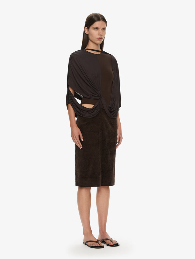 A semi-sheer mesh overlay is gathered and suspended over a stretch rib base, creating an asymmetrical silhouette that reveals the arms through open slits and is anchored by a central knot at the waist. Finished with a high neckline and soft raw edges, contrasts sculptural drape with clean, columnar form.