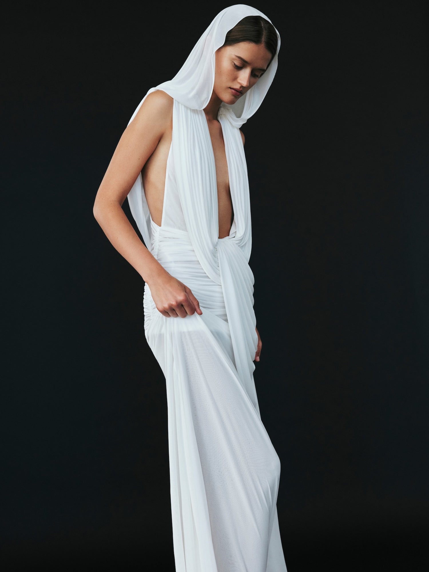Cut in a signature draped jersey, this featherweight slink jersey drape gown features elongated suspended panels with ruched and twist detail