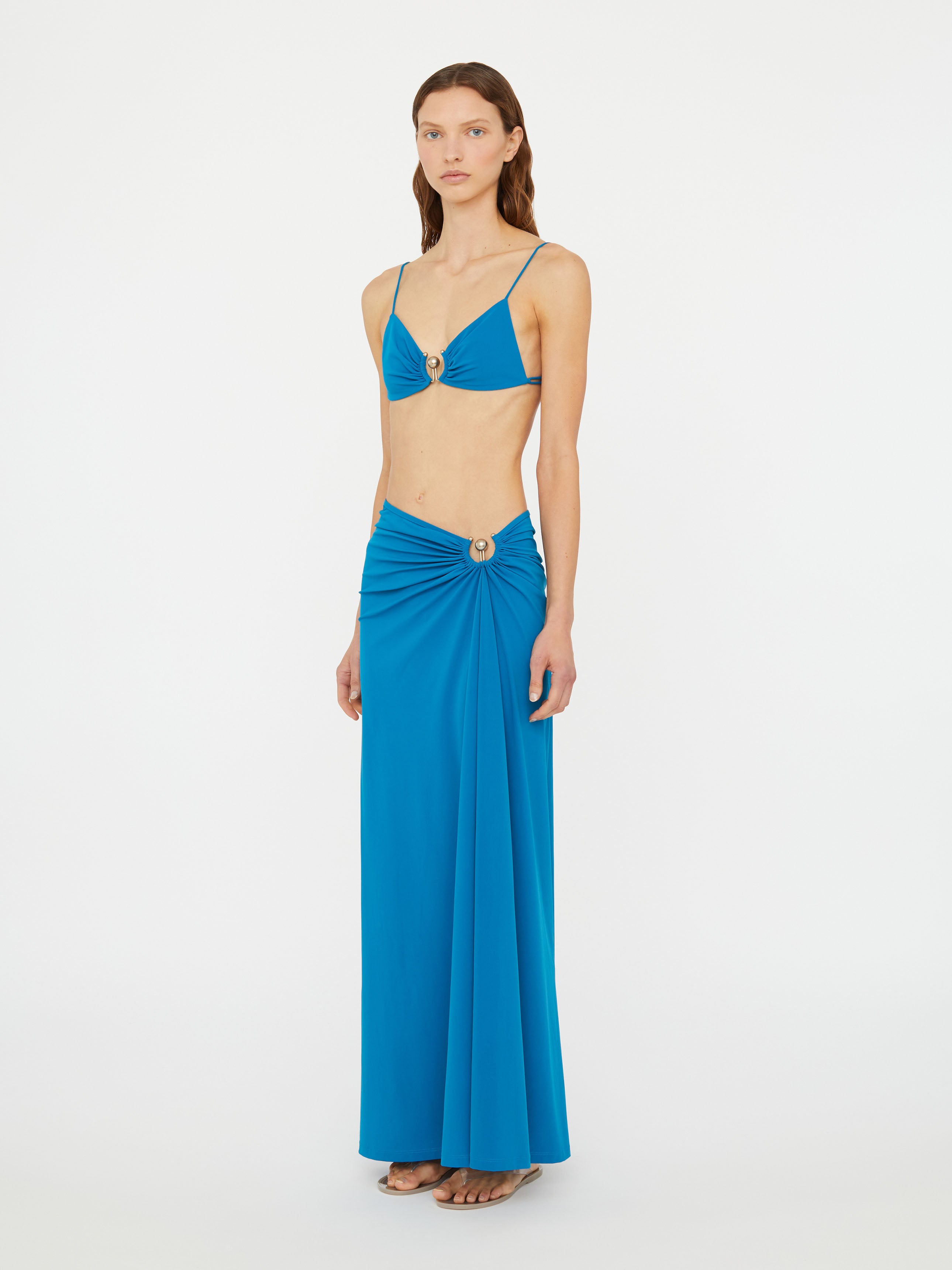 Hooked with a sculpted metal adornment, this maxi a-line skirt features an open split front, ruched and anchored by signature orb hardware.