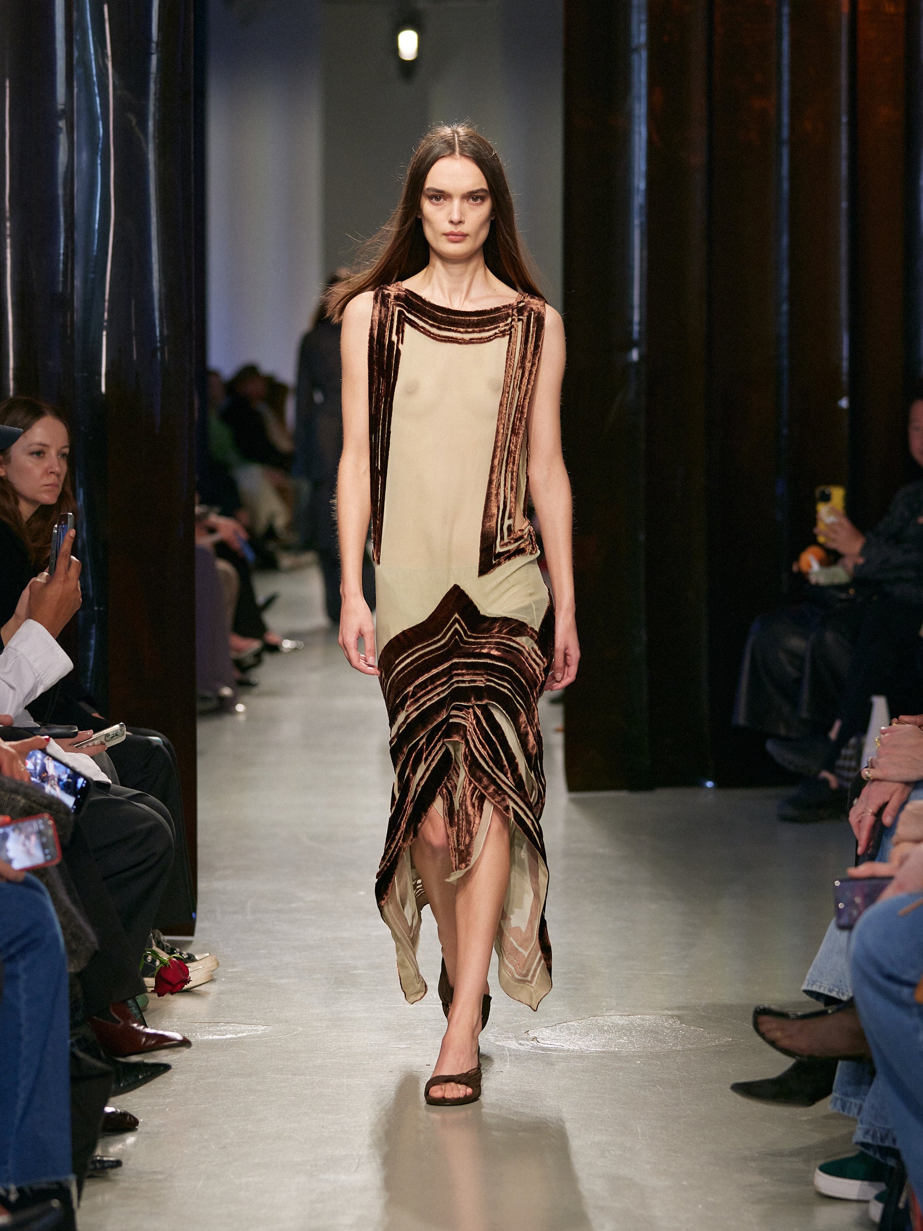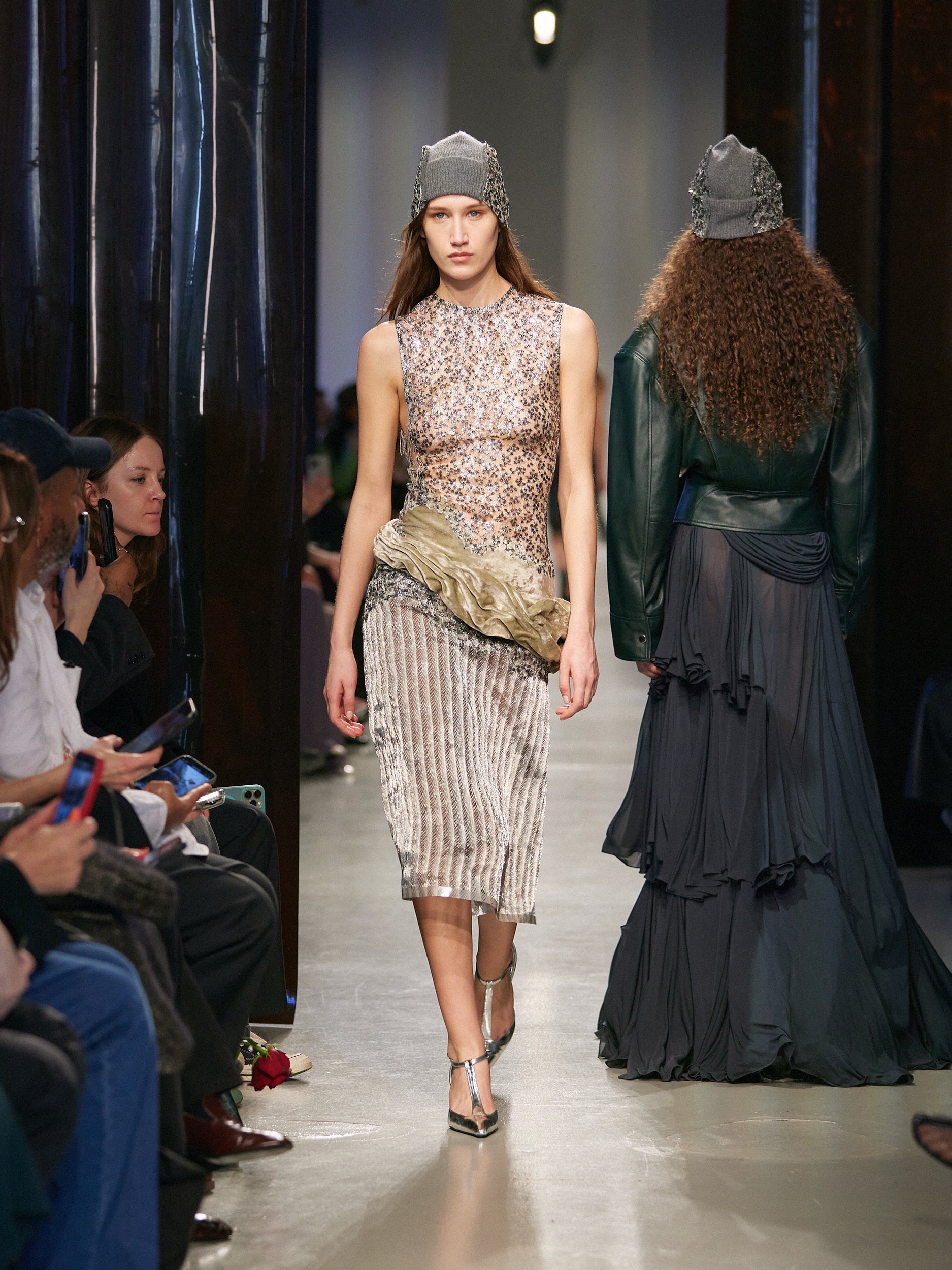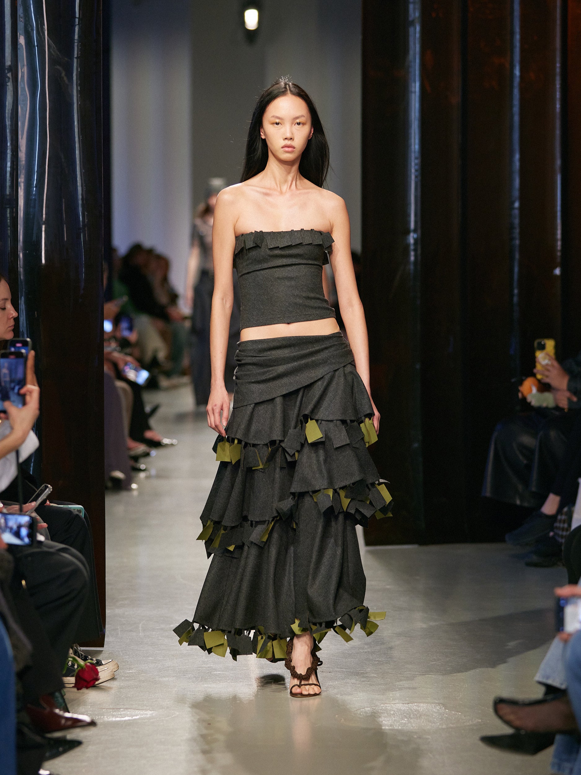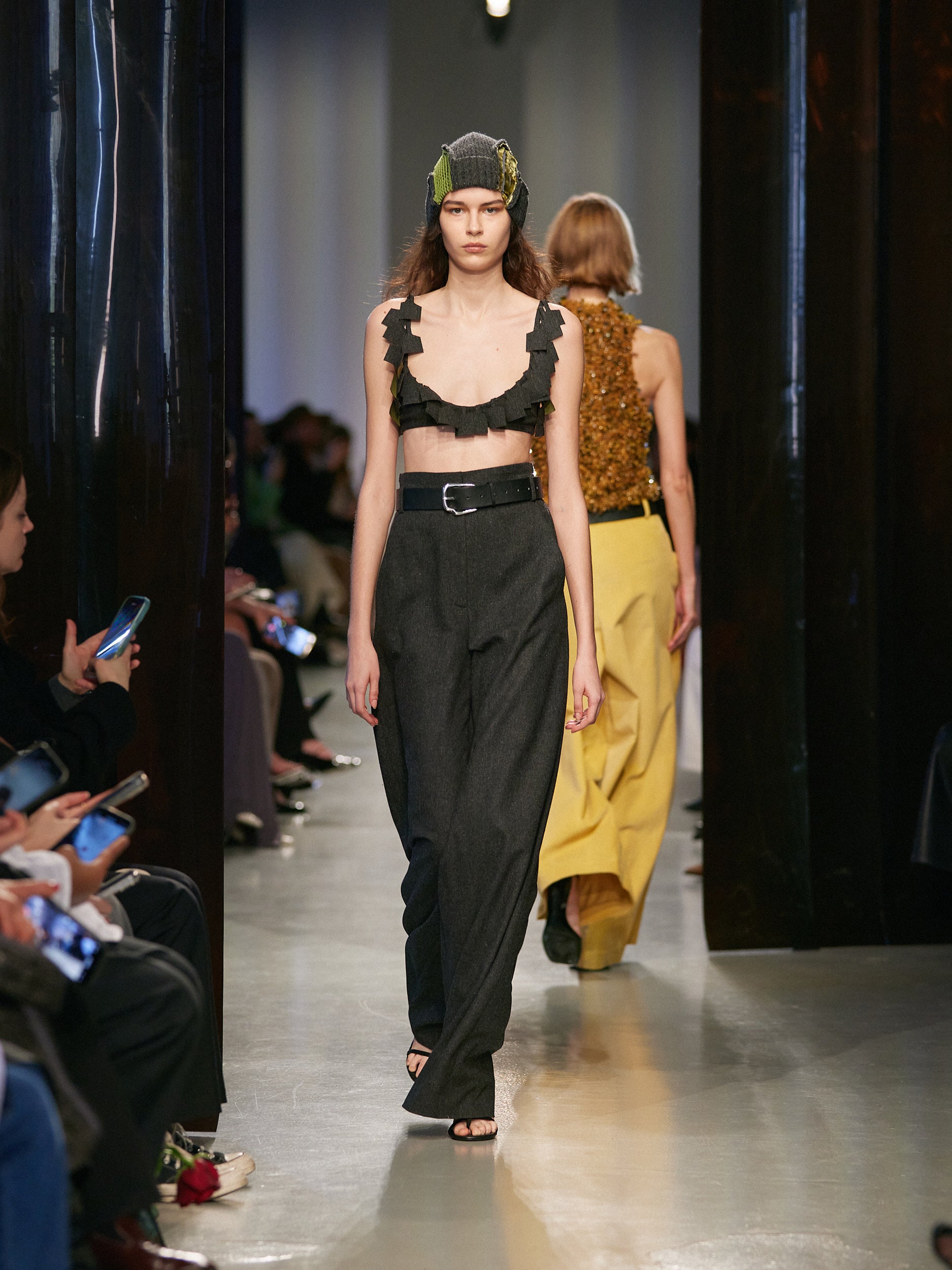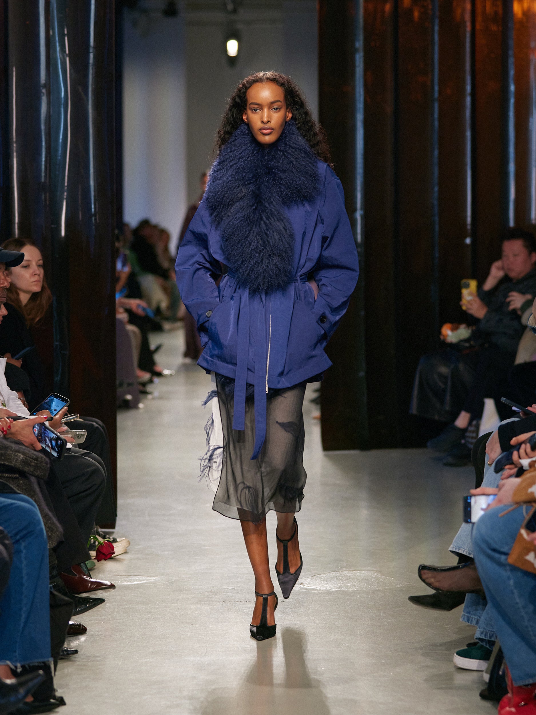 The palette zeroed in on effortless elegance, where deep navy interacted with mustard, and rich purples and blacks gained a sense of levity alongside frothy sage greens. Liquorice, maroon and espresso leathers added depth, while metallic laces intertwined with metal accents, merging with plush velvets.