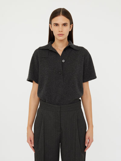 A placket detail polo-inspired knit top crafted in a light 100% cashmere knit, and finished with a finely ribbed trim that draws in at the waist.